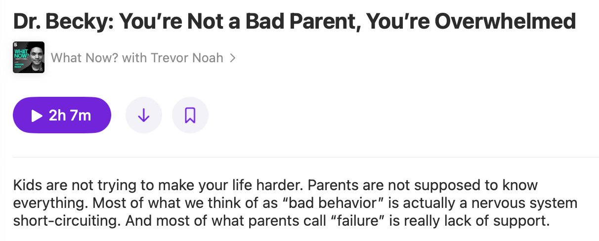 Acest episod este recomandat pentru felul în care combină umorul lui Trevor Noah cu perspectiva profund empatică a lui Dr. Becky Kennedy asupra parentingului și relațiilor. Discuția atinge teme precum tantrumuri, copleșire, rușine, minciună, atașament și reparație, oferind părinților un cadru clar și plin de compasiune pentru a-și vedea copiii (și pe ei înșiși) ca fiind „buni în interior”, chiar și atunci când comportamentele sunt dificile.